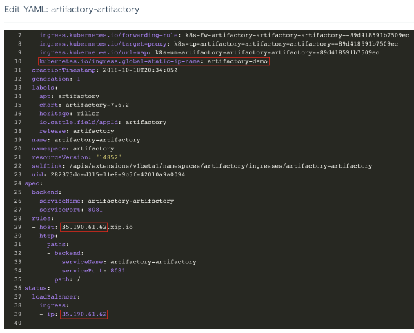 This sets the hostname for Artifactory. Part of the magic of xip.io is that we can create any subdomain and have it resolve back to the IP, so when we use docker-demo.35.190.61.62.xip.io later in this walkthrough, it will resolve to 35.190.61.62.